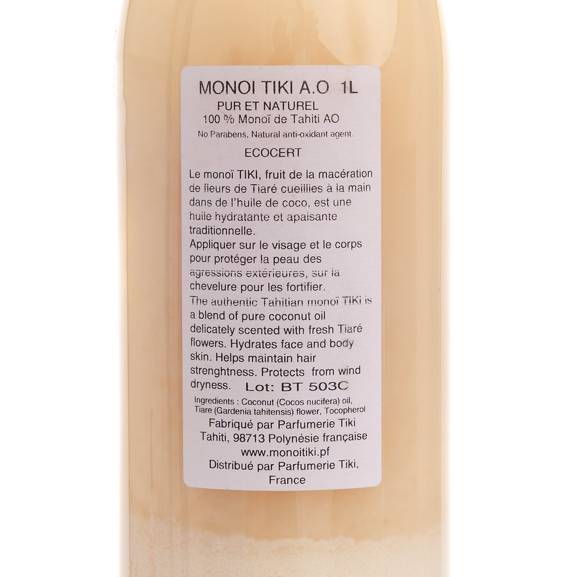 - Matière: 100% Monoi de Tahiti Appellation of Origin (AO). Cocos nucifera (coconut) oil, Gardenia Taitensis Flower Extract, Tocopherol (Vitamin E).