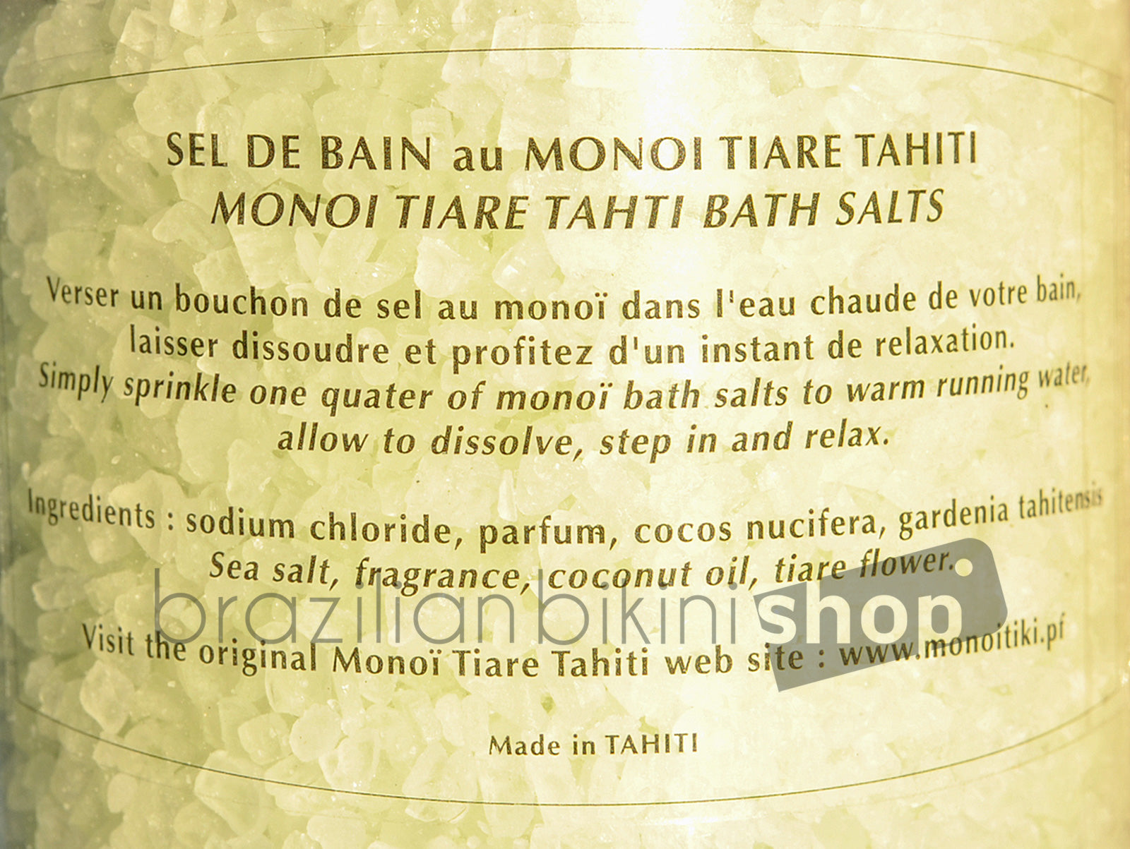 - Matière: 0.5% Monoï de Tahiti Appellation of Origin (AO). Sodium chloride, Cocos nucifera (coconut) oil, Gardenia Taitensis Flower Extract, Parfum (Fragrance), Tocopherol (Vitamin E), CI 45430, Amyl cinnamal, Benzyl Alcohol, Benzyl benzoate, Benzyl salicylate, Cit
