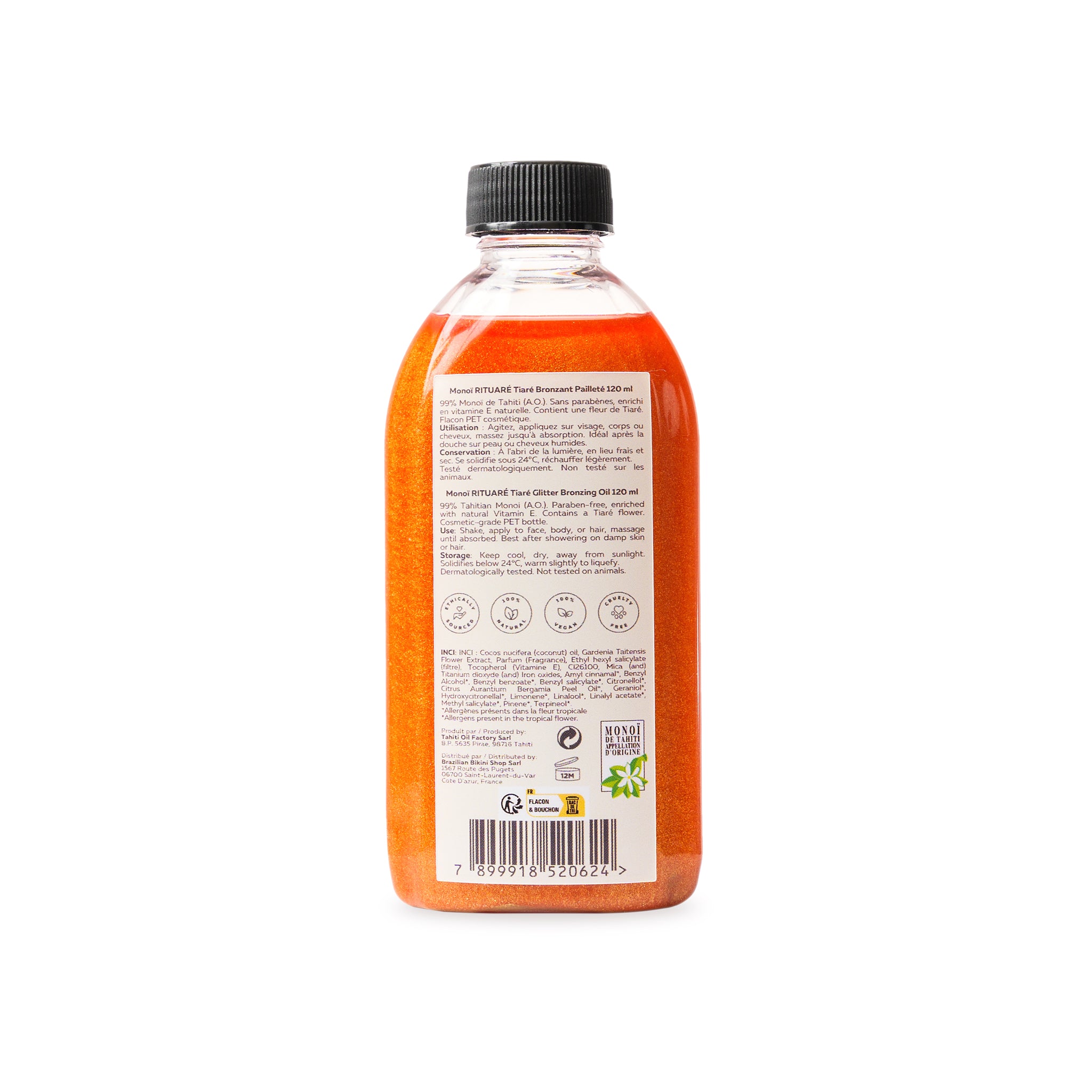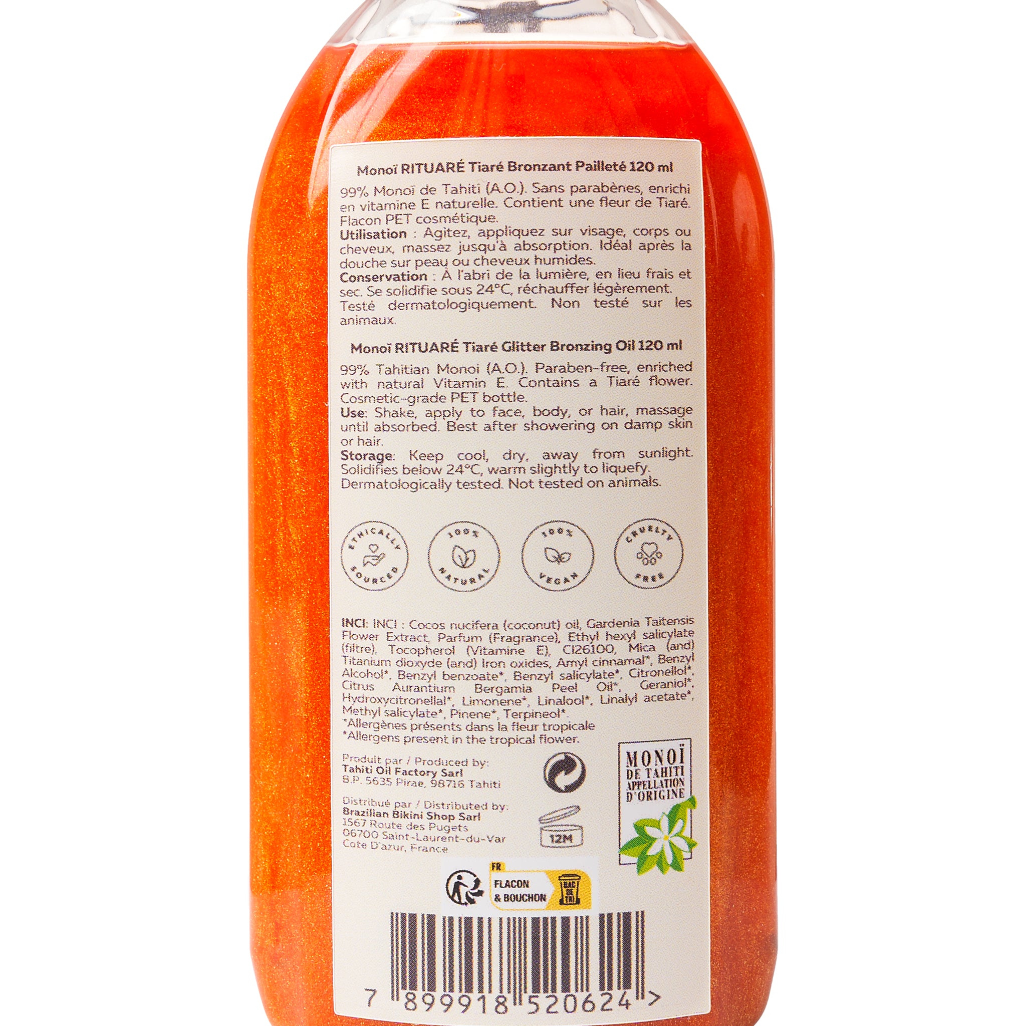 - Matière: 99 % de Monoï de Tahiti Appellation d'Origine ECOCERT COSMOS. Cocos nucifera oil, Gardenia tahitensis, Parfum, Tocopherol. Paraben-free.